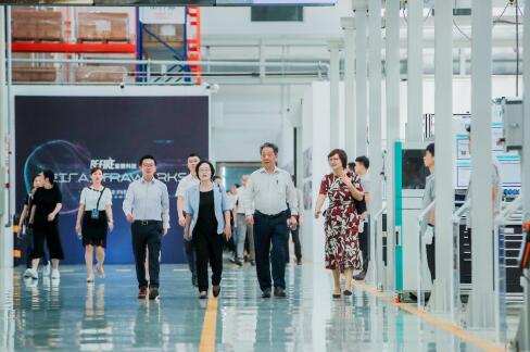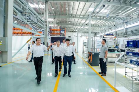 中國汽車工業(yè)協(xié)會原常務副會長、中國汽車動力電池產業(yè)創(chuàng)新聯(lián)盟理事長董揚(前排右二),中國汽車工業(yè)協(xié)會專務副秘書長、汽車動力電池產業(yè)創(chuàng)新聯(lián)盟秘書長許艷華(前排右三)等領導參觀重塑科技常熟產業(yè)化基地產線