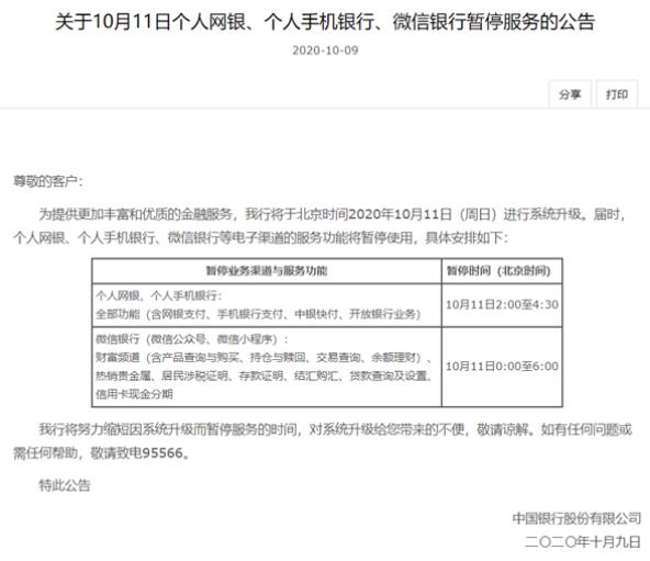 中國(guó)銀行:10月11日暫停網(wǎng)銀和手機(jī)銀行服務(wù)