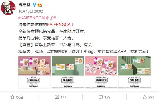 日前,肯德基官微宣布推出KAIFENGCAI(開封菜)系列全新快煮預(yù)包裝食品,當(dāng)然主題還是和雞有關(guān),首季上新菜包括雞胸肉、雞湯、雞肉螺獅粉。