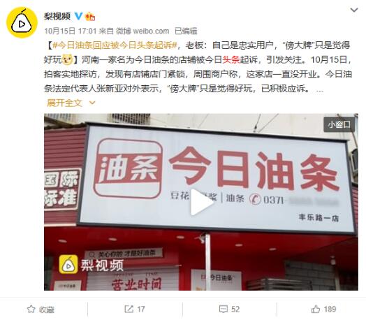 對(duì)于被今日頭條起訴一事,油條老板回應(yīng)亮稱“只是覺得“傍大牌”好玩。”
