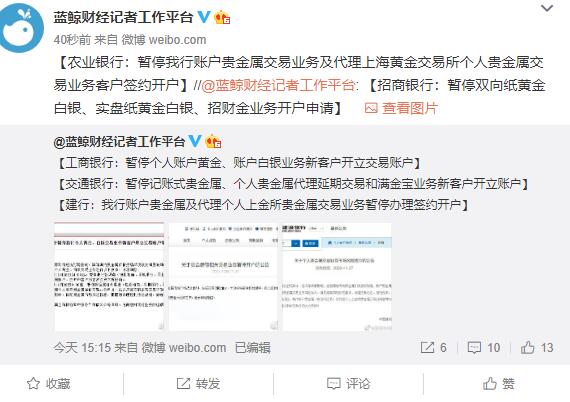 工商銀行、交通銀行、農業(yè)銀行、建設銀行、招商銀行等集體發(fā)布公告,宣布暫停個人貴金屬交易開戶。