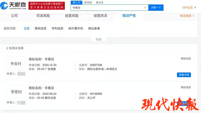 △ 天眼查查詢發(fā)現(xiàn)“爺青回”已被申請注冊商標(biāo),網(wǎng)絡(luò)截圖