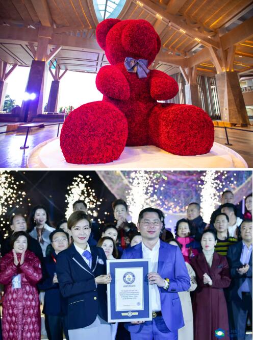 活動現(xiàn)場,還布置了八米高七噸重的萬朵玫瑰花拼成的“最大玫瑰花熊”,為新人祝賀。12月20日晚七點,世界吉尼斯記錄認證官侯穎小姐也現(xiàn)場完成了“最大玫瑰花熊”的吉尼斯世界記錄認證。