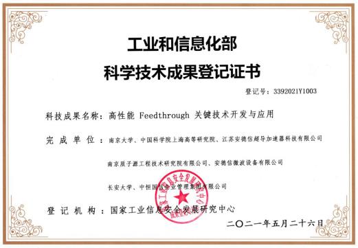 2021年5月26日,國家工業(yè)和信息化部國家工業(yè)信息安全發(fā)展研究中心依據(jù)《中華人民共和國科學(xué)技術(shù)進步法》、 《中華人民共和國促進科技成果轉(zhuǎn)化法》、《科學(xué)技術(shù)評價辦法》、《科技評估管理暫行辦法》, 在南京大學(xué)仙林校區(qū)現(xiàn)代工程與應(yīng)用科學(xué)學(xué)院X101會議室主持召開了由南京大學(xué)、中國科學(xué)院上海髙等研究院、江蘇安德信超導(dǎo)加速器科技有限公司、南京質(zhì)子源工程技術(shù)研究院有限公司、安德信微波設(shè)備有限公司、長安大學(xué)、中恒國信企業(yè)管理集團有限公司聯(lián)合自主研發(fā)的“高性能Feedthrough關(guān)鍵技術(shù)開發(fā)與應(yīng)用"科技成果評價會。