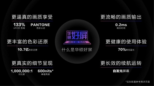 只要是擁有“華碩好屏”官方認(rèn)證的筆記本電腦,那么它的屏幕素質(zhì)無疑就有著穩(wěn)妥的保障。華碩OLED屏幕擁有2.8K / 4K分辨率,覆蓋100%DCI-P3廣色域并通過PANTONE色彩認(rèn)證、10bit色深能夠呈現(xiàn)10.7億色彩、1000000:1高對比度、0.2ms極速響應(yīng)時間、90Hz高刷新率、降低70%有害藍(lán)光,峰值亮度最高可達(dá)600nits(以產(chǎn)品具體規(guī)格為準(zhǔn)),以頂尖實力賦能生活娛樂、商務(wù)辦公所需。