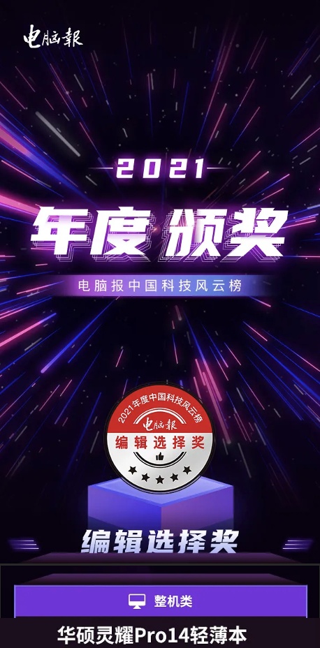一舉擊中用戶需求的靈耀Pro14,還榮獲2021年度電腦報中國科技風(fēng)云榜編輯選擇獎。
