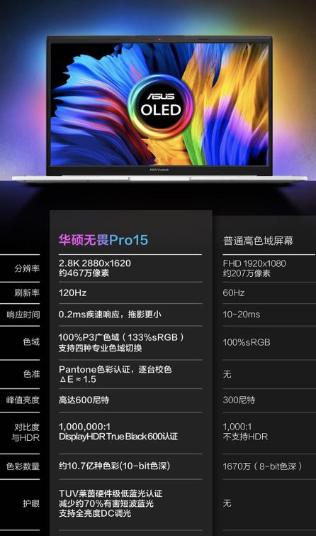 在保持高性能創(chuàng)作的同時,無畏Pro15 2022的屏幕素質(zhì)也同樣令人稱贊。作為#華碩好屏3.0#的又一成員,它搭載2.8K 120Hz OLED HDR屏,采用E4發(fā)光材質(zhì),在色彩、亮度、對比度等參數(shù)上全方位超越傳統(tǒng)筆記本屏幕,大屏實力嘆為觀止。