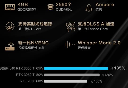 顯卡方面,靈耀Pro16 2022搭載Nvidia GeForce RTX 3050Ti光追獨顯。全新Ampere架構,擁有2560個CUDA核心以及4GB GDDR6顯存。在DLSS AI加速和Dynamic Boost2.0顯卡智能動態(tài)增強技術的參與下,功耗可提升至65W,較RTX 2050提升74%的性能,讓這塊RTX 3050Ti成為一塊真正的“性能猛獸”,能夠輕松處理各種創(chuàng)作素材和動畫渲染。
