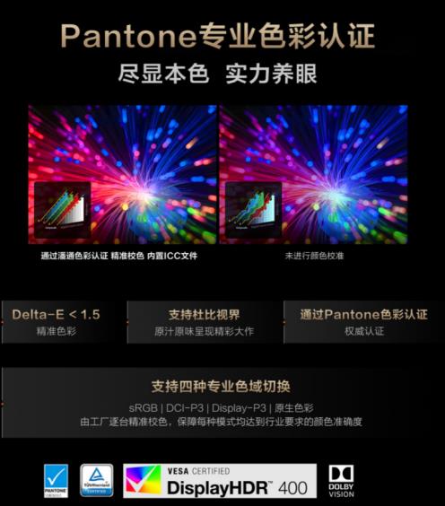 靈耀Pro16 2022的這塊擁有100% DCI-P3影院級廣色域的屏幕還內置了定制ICC文件(平均Delta E<1.5),擁有Pantone色彩認證、VESA DisplayHDR True Black 400認證,讓屏幕中所呈現(xiàn)的內容更貼近真實,也為HDR視頻觀影和內容創(chuàng)作奠定了良好基礎。