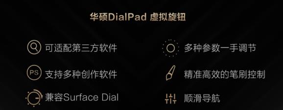 華碩獨有的DialPad虛擬旋鈕進一步優(yōu)化迭代,為用戶提供了更加智能的創(chuàng)作體驗。DialPad虛擬旋鈕擁有70多種功能,多種參數(shù)一手控制,多種筆刷指尖調節(jié),圖層、時間軸等功能精準控制,讓創(chuàng)作工作流程將會變得更加順暢。華碩DialPad虛擬旋鈕目前可兼容多款創(chuàng)作辦公軟件,也兼容Surface Dial等輔助設備。