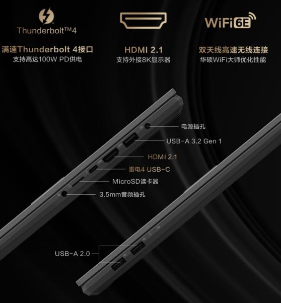 靈耀Pro16 2022配備有雷電4 Type-C等多種常用接口,拓展性全面,全接口的設計保證了創(chuàng)作者多端設備協(xié)作的需求。其中功能最為強大的雷電4接口具有高達40Gbps的傳輸速度,能夠外接高性能顯卡塢、高速SSD、8K顯示器等,滿足各類擴展需求。