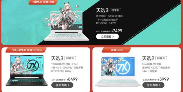 大眾玩家首選滿血3060游戲本華碩天選3銳龍版,配置144Hz高刷電競屏,5月31日晚8點(diǎn)直降500元,到手僅需7499元更享3期免息;配置12代酷睿、滿血3060及2.5K 165Hz P3色域電競屏的天選3直降1000元,到手8499同樣享3期免息;最超值的天選2游戲本,RTX 3050+144Hz高刷屏,入手低至5999元,天選老婆輕松帶回家!