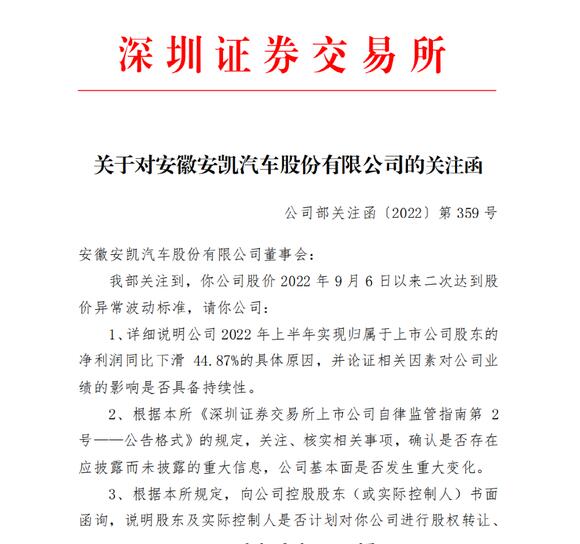 根據(jù)公告,深交所要求安凱客車詳細(xì)說明公司2022年上半年實(shí)現(xiàn)歸屬于上市公司股東的凈利潤同比下滑44.87%的具體原因,并論證相關(guān)因素對公司業(yè)績的影響是否具備持續(xù)性;確認(rèn)是否存在應(yīng)披露而未披露的重大信息,公司基本面是否發(fā)生重大變化;核查公司董事、監(jiān)事、高級管理人員及其直系親屬是否存在買賣你公司股票的行為,是否存在涉嫌內(nèi)幕交易的情形;詳細(xì)說明近期接待機(jī)構(gòu)和個人投資者調(diào)研的情況,是否存在違反公平披露原則的事項(xiàng)等。
