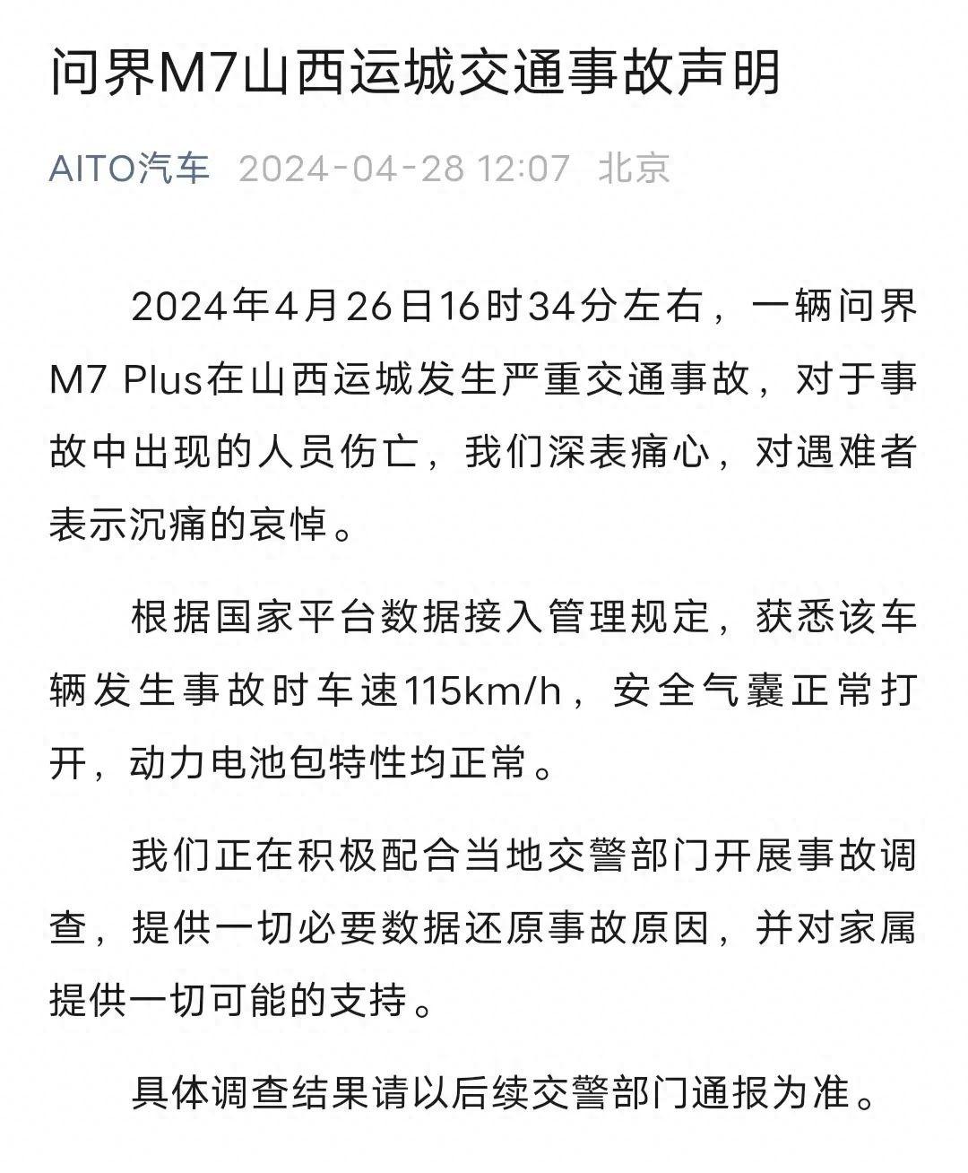 4月28日午間,AITO汽車發(fā)布問界M7山西運(yùn)城交通事故聲明稱,4月26日16時(shí)34分左右,一輛問界M7 Plus在山西運(yùn)城發(fā)生嚴(yán)重交通事故,對(duì)于事故中出現(xiàn)的人員傷亡,深表痛心,對(duì)遇難者表示沉痛的哀悼。根據(jù)國家平臺(tái)數(shù)據(jù)接入管理規(guī)定,獲悉該車輛發(fā)生事故時(shí)車速115km/h,安全氣囊正常打開,動(dòng)力電池包特性均正常。